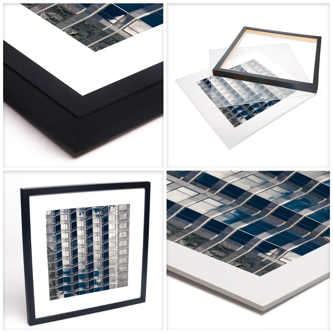A modern Gallery Frame. Available in Black, this frame adds a clean, crisp look to any setting. It arrives with a glare-resistant acrylic ready to display on your walls.