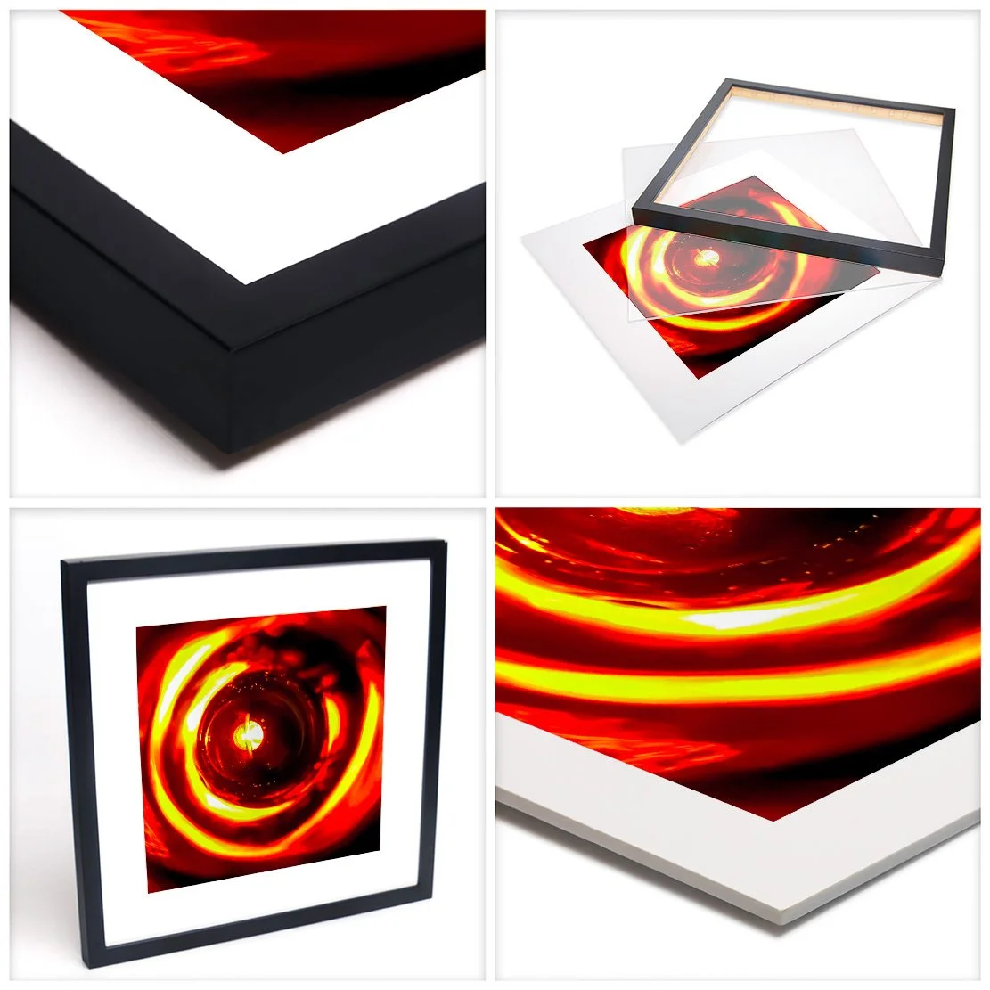 A modern Gallery Frame. Available in Black, this frame adds a clean, crisp look to any setting. It arrives with a glare-resistant acrylic ready to display on your walls.