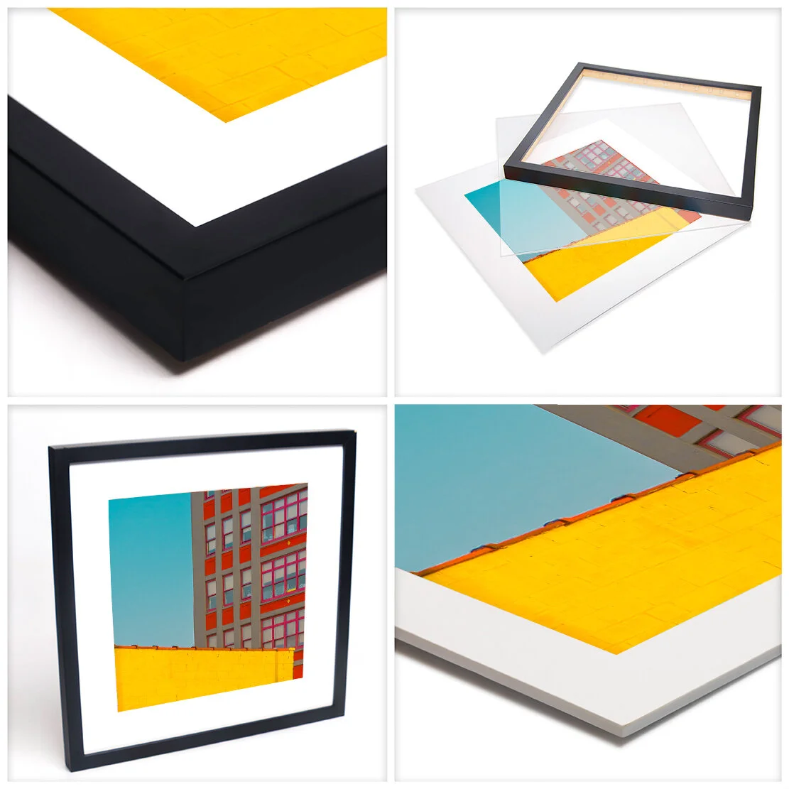 A modern Gallery Frame. Available in Black, this frame adds a clean, crisp look to any setting. It arrives with a glare-resistant acrylic ready to display on your walls.