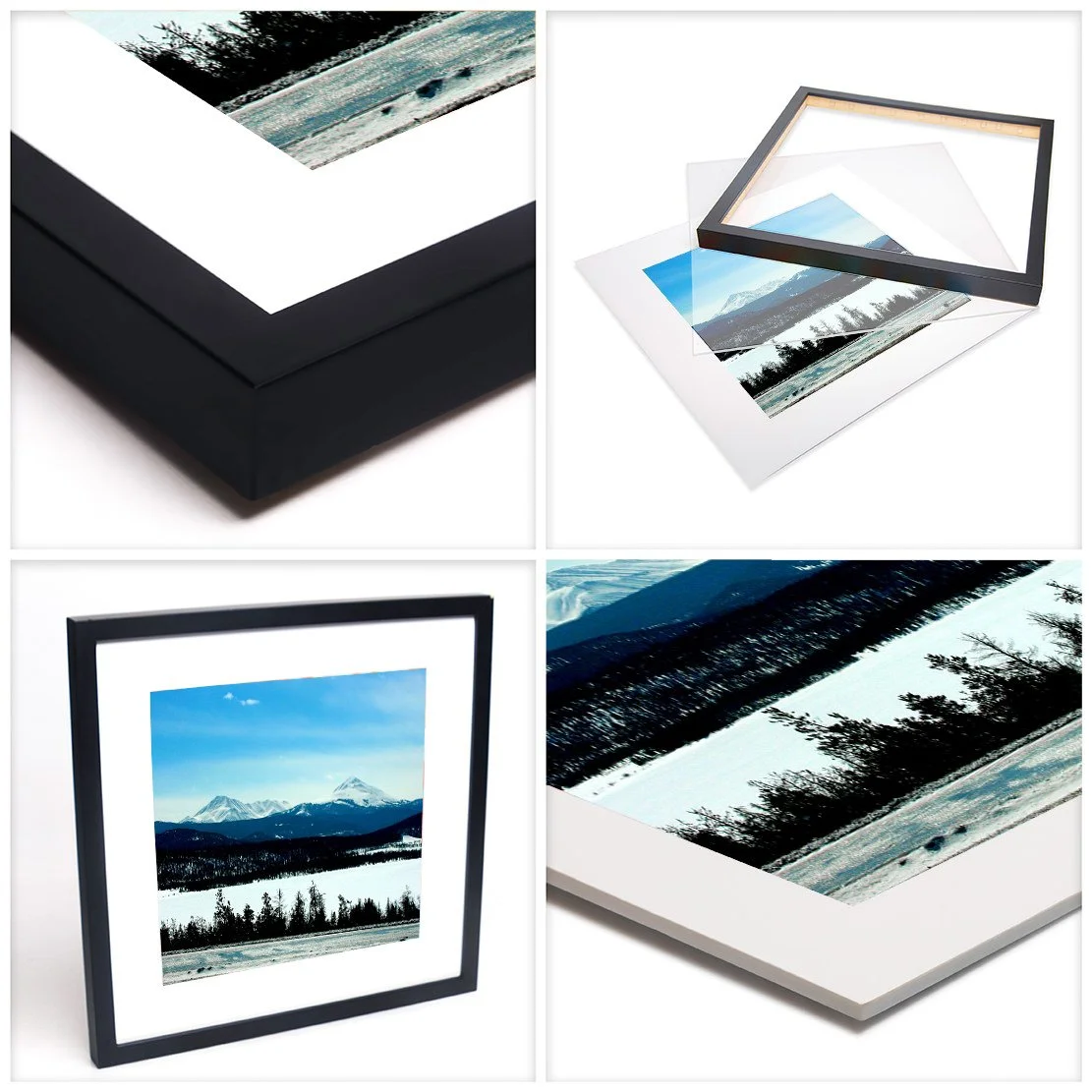 A modern Gallery Frame. Available in Black, this frame adds a clean, crisp look to any setting. It arrives with a glare-resistant acrylic ready to display on your walls.
