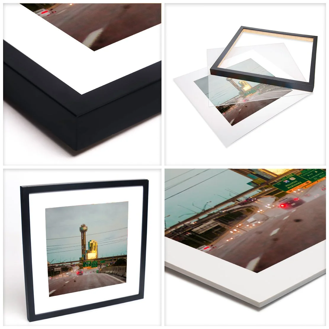 A modern Gallery Frame. Available in Black, this frame adds a clean, crisp look to any setting. It arrives with a glare-resistant acrylic ready to display on your walls.