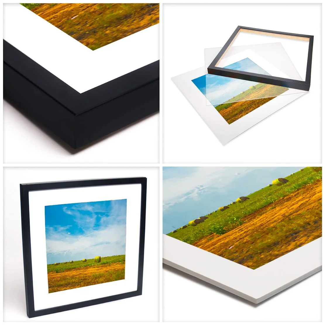A modern Gallery Frame. Available in Black, this frame adds a clean, crisp look to any setting. It arrives with a glare-resistant acrylic ready to display on your walls.