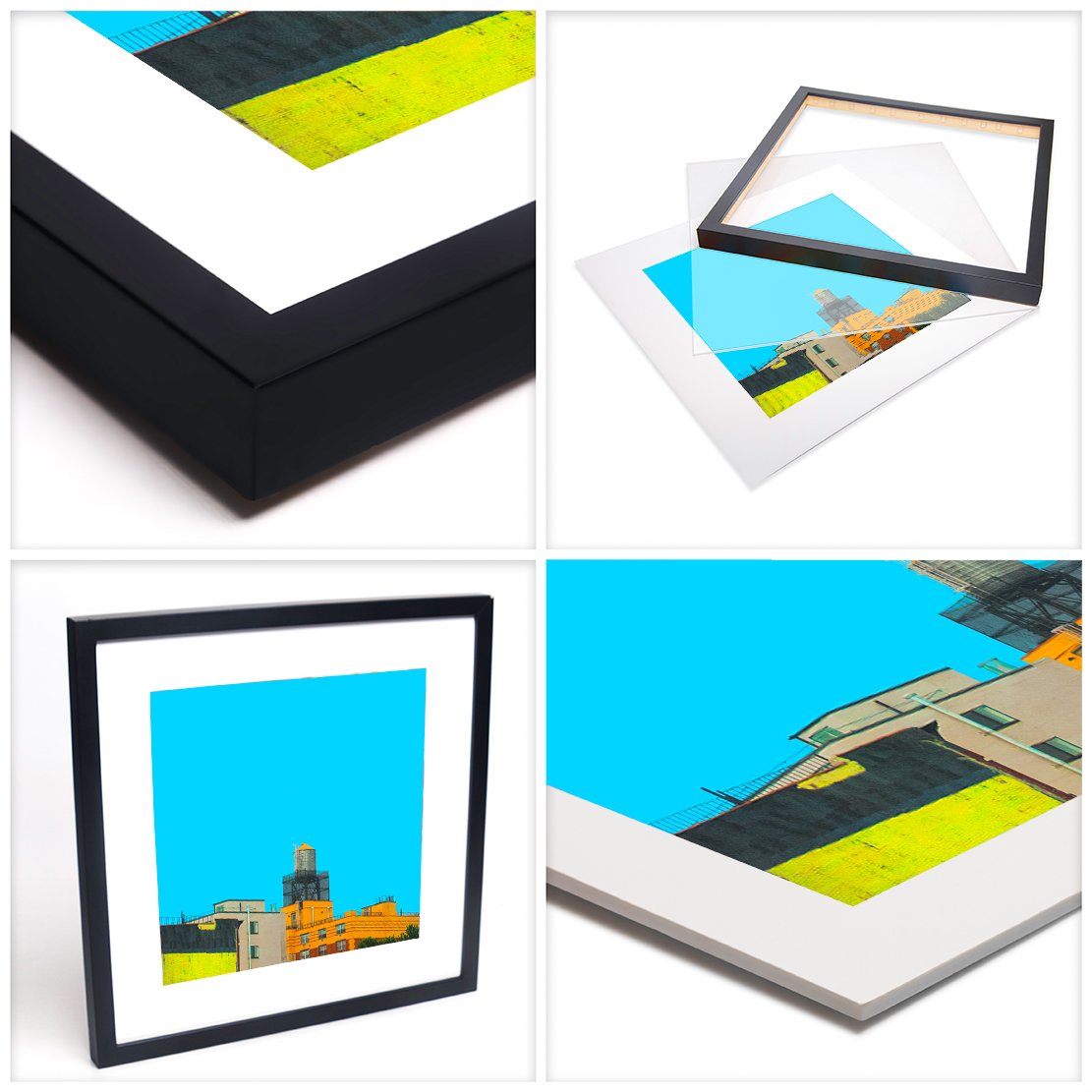A modern Gallery Frame. Available in Black, this frame adds a clean, crisp look to any setting. It arrives with a glare-resistant acrylic ready to display on your walls.