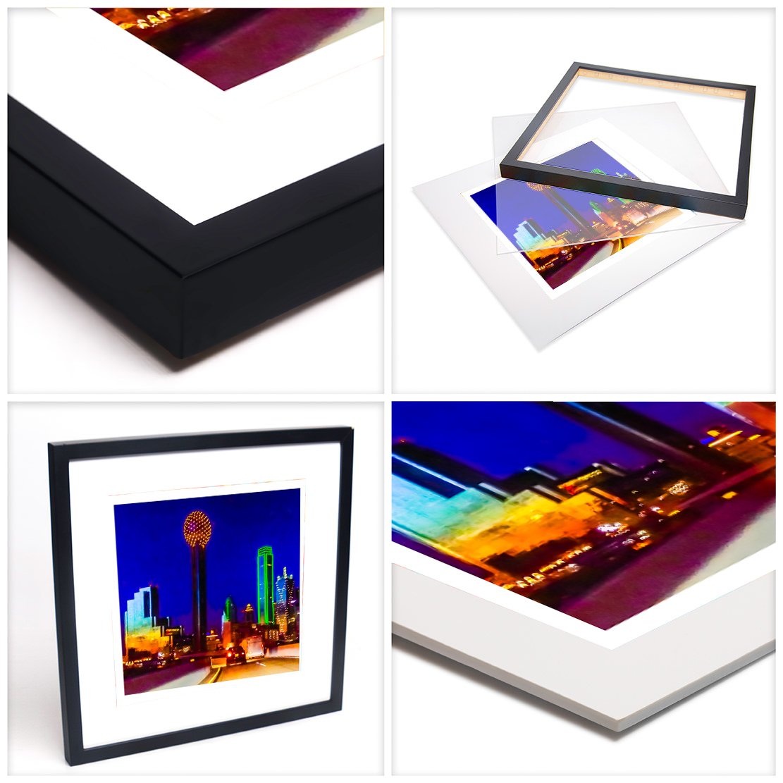 A modern Gallery Frame. Available in Black, this frame adds a clean, crisp look to any setting. It arrives with a glare-resistant acrylic ready to display on your walls.