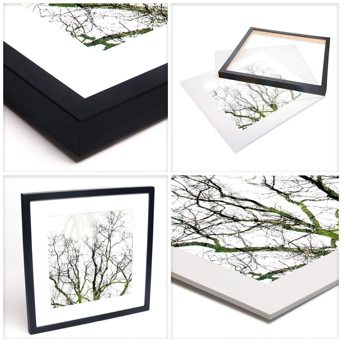 A modern Gallery Frame. Available in Black, this frame adds a clean, crisp look to any setting. It arrives with a glare-resistant acrylic ready to display on your walls.