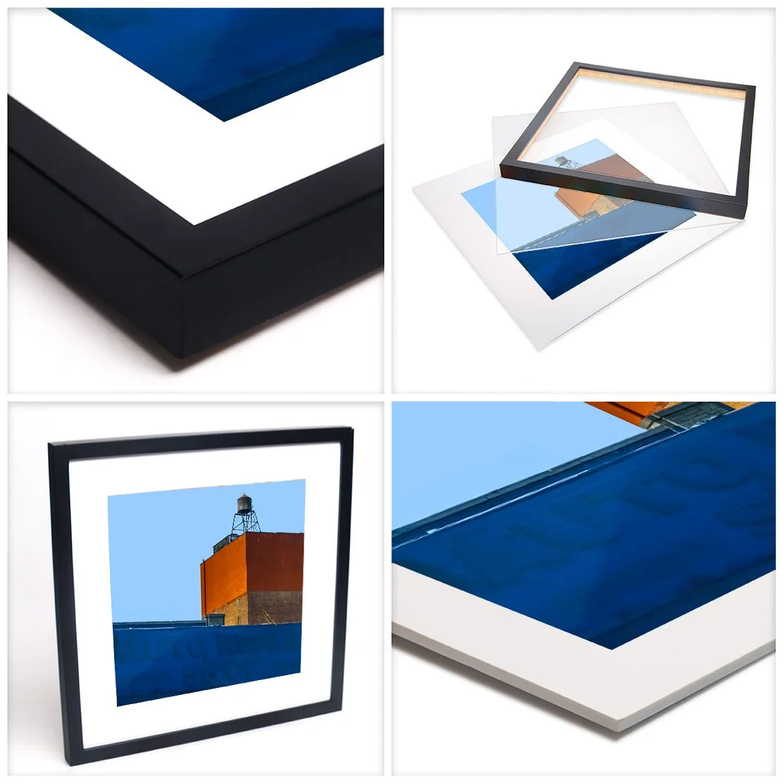 A modern Gallery Frame. Available in Black, this frame adds a clean, crisp look to any setting. It arrives with a glare-resistant acrylic ready to display on your walls.